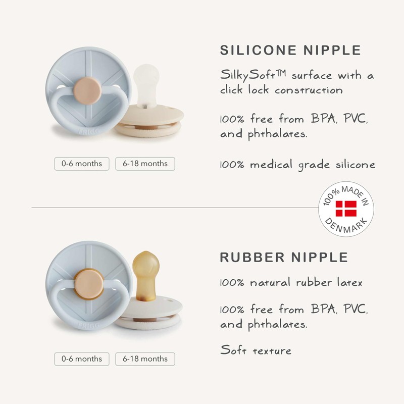 - Available in a range of soft colors, FRIGG pacifiers make a beautiful addition to your collection of baby essentials. Designed and manufactured in Denmark.