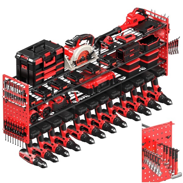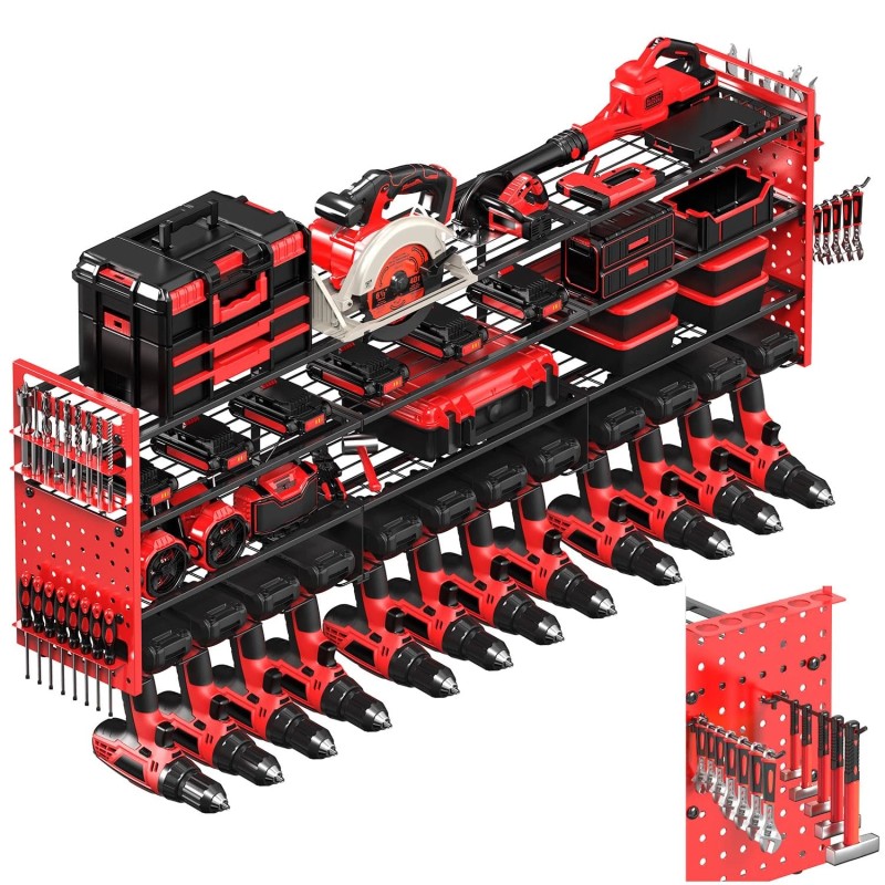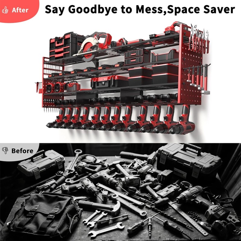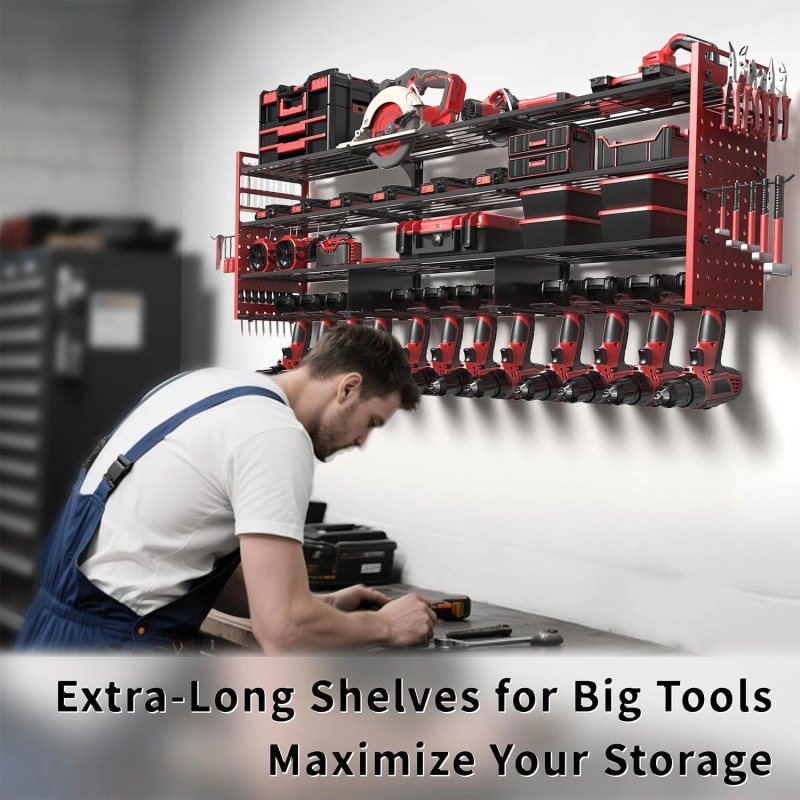 💪【 52.4" 4-Tier Power Tool Organizer Storage with 12 Cordless Drills Rack】 This power tool organizer wall mount features a 4-tier structure with a total length of 52.4 inches. Store up to 12 Cordless Drills on the bottom tier, with spacious compartments above for batteries, toolboxes, hammers, angle grinders, heat guns, and more. Ideal for keeping every tool within reach and your garage clutter-free.