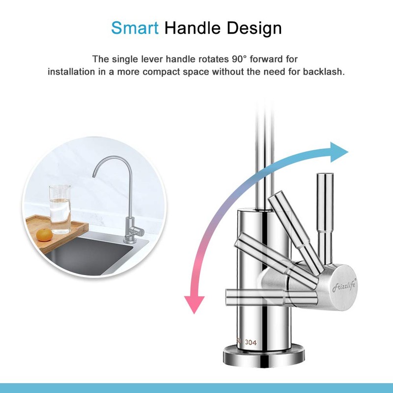 - ✔SMART HANDLE DESIGN & 360 DEGREE SWIVEL SINK FAUCET: the water filter faucet comes with 90 degree dropless operation single push level for quick and easy cold water control. 360 degree all the free rotation you want, high-arch spout design with 360-degree rotation offers more room for a variety of sink activities in kitchen.