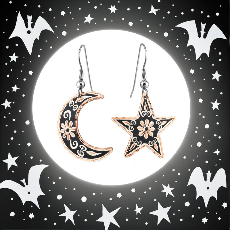 - Handcrafted Crescent moon and star earrings feature black flower design moon star Earrings, mismatched dangle earrings, moon and star jewelry, Gifts for women Birthday gifts