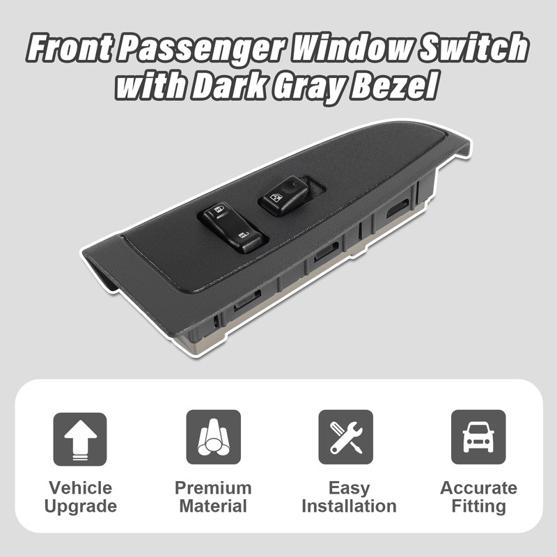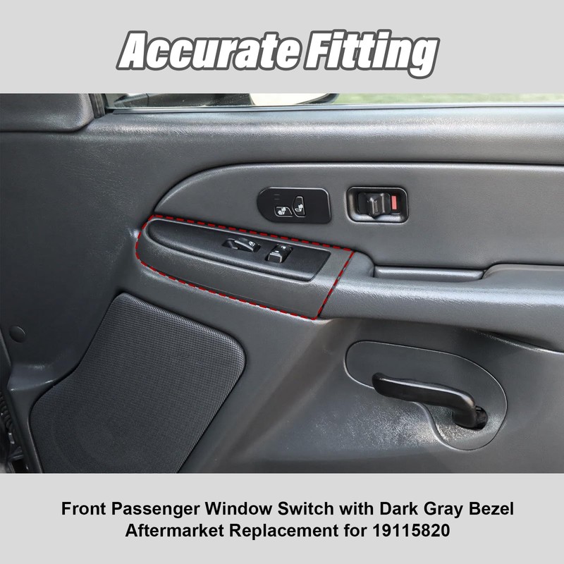 - Reliable Service: Provide front passenger window switch with dark gray bezel for Chevrolet Silverado 90 days for return or replacement without reason. Contact us for assistance if any issues arise.