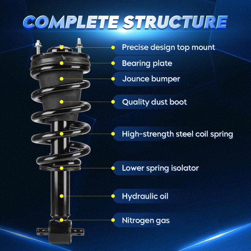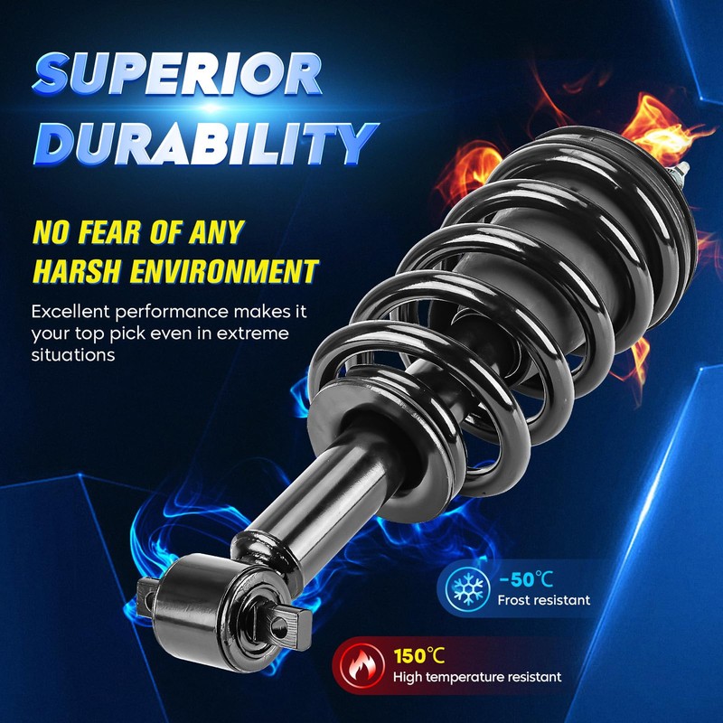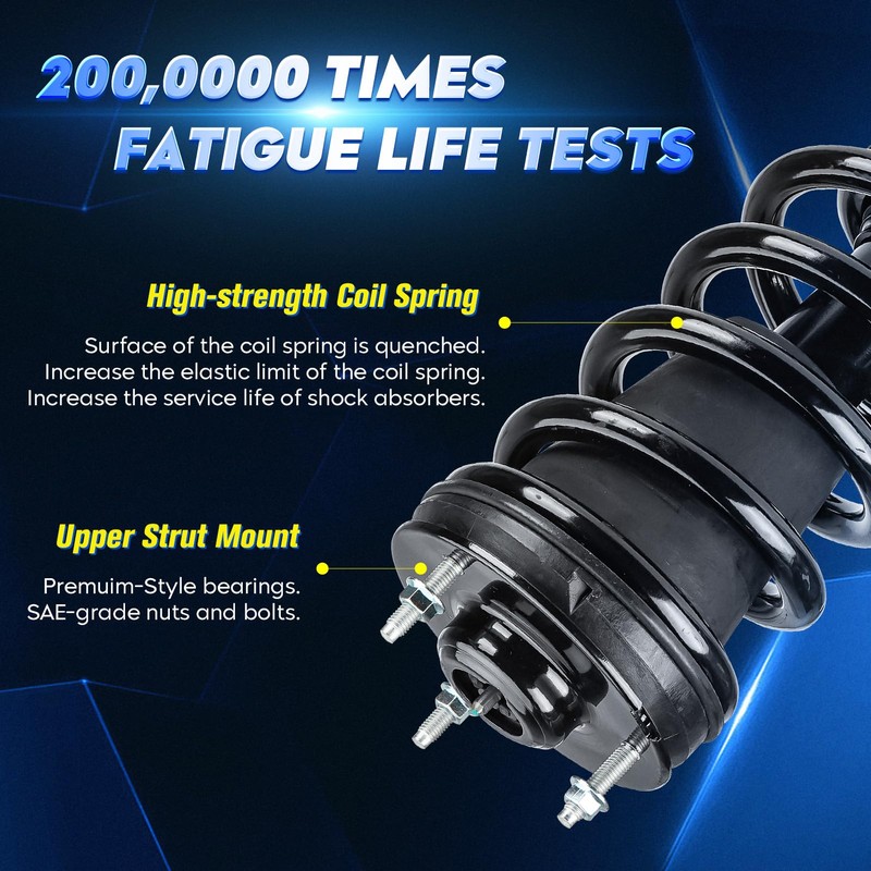 - Kit Includes: 1x front left strut shock assembly with coil spring, 1x front right strut shock assembly with coil spring