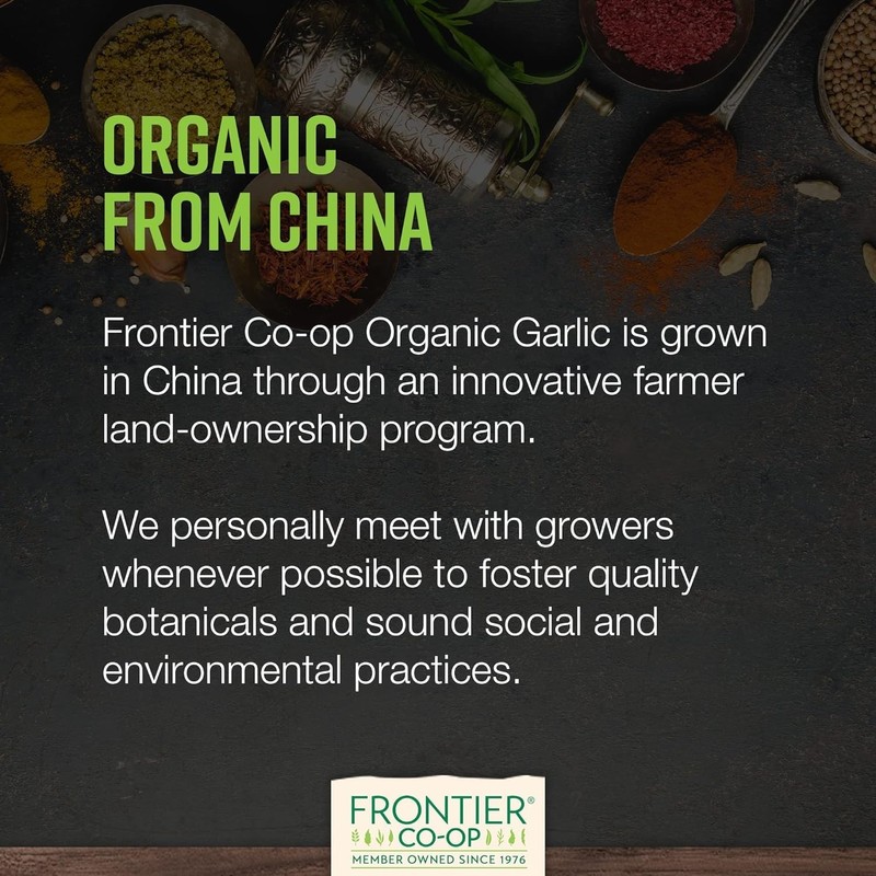 - ORGANIC FROM CHINA - Frontier Co-op Organic Garlic is grown in China through an innovative farmer land-ownership program. We personally meet with growers whenever possible to foster quality botanicals and sound social and environmental practices.