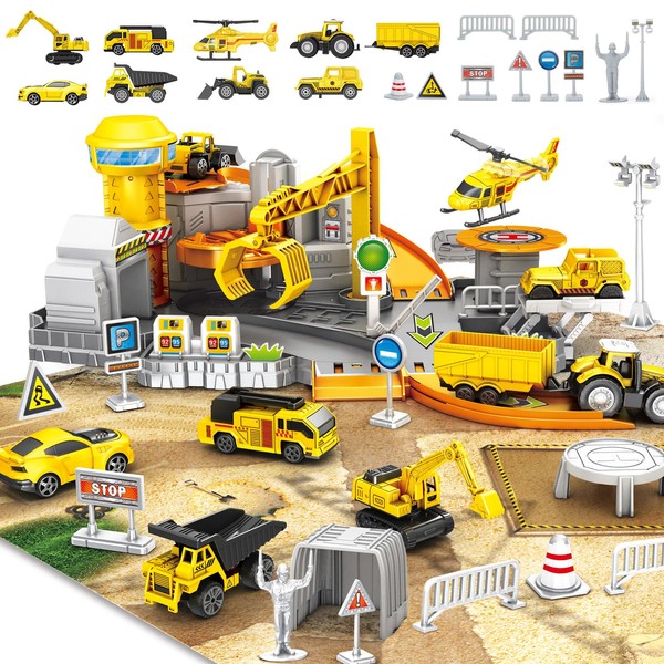 - Construction Toys Track Set: Ideal kids toys include excavator, bulldozer, dumper, haul truck, engineering cars, je-ep, moveable crane, race track, helicopter, map, road signs, builder & more construction base accessories. Abundant toys for boys and girls
