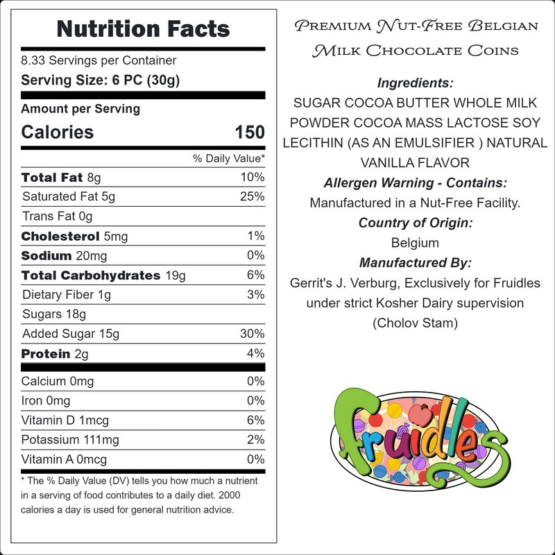 - These Chocolate Milk Chocolate Gold Coins which are Made with High-Quality Premium Belgium Chocolate are the Highlight of the Party. The Half-Dollar gelt chocolate coins add Fun and Atmosphere to your Party that will leave Good Memories for all your Guests.