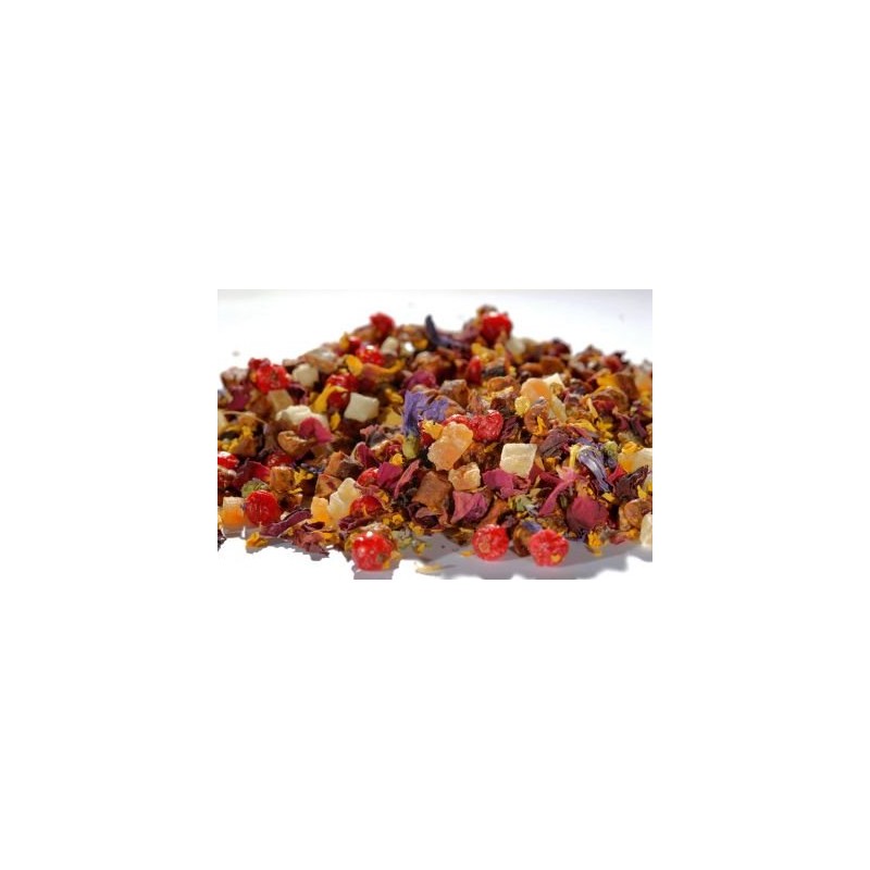 - Ingredients: pear pieces (55%), pineapple pieces (10%) (pineapple, sugar, acidifier: citric acid), papaya pieces (papaya, sugar), mango pieces (mango, sugar, acidifier: citric acid), acidifier: tartaric acid, aroma, date pieces, fig pieces, rose petals, sunflower flowers, red joh. annisberberberberbervein flowers.