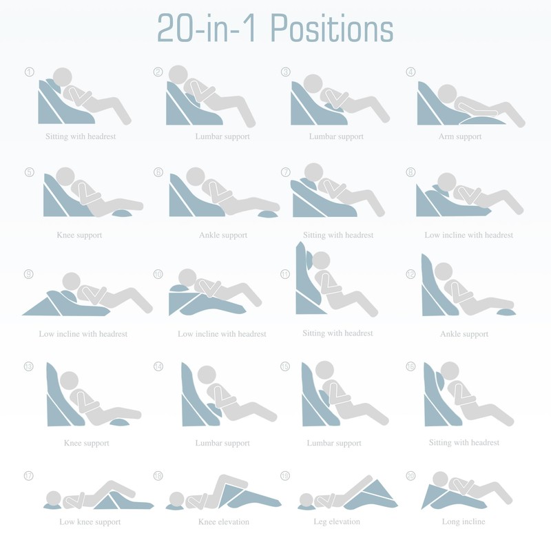 - 20-IN-1 VERSATILE DESIGN: The wedge pillow for sleeping can be used not only while sleeping, but also to enjoy comfortable feeling during leisure time such as watching TV and reading. It has 20 combinations and adjustable height options to meet the individual requirements of different people for sleep positions and needs. 20-in-1 bed wedge & body position allow s you to adjust angle such as 30 degrees, 45 degrees, 60 degrees and even more to relieve night-time symptoms.