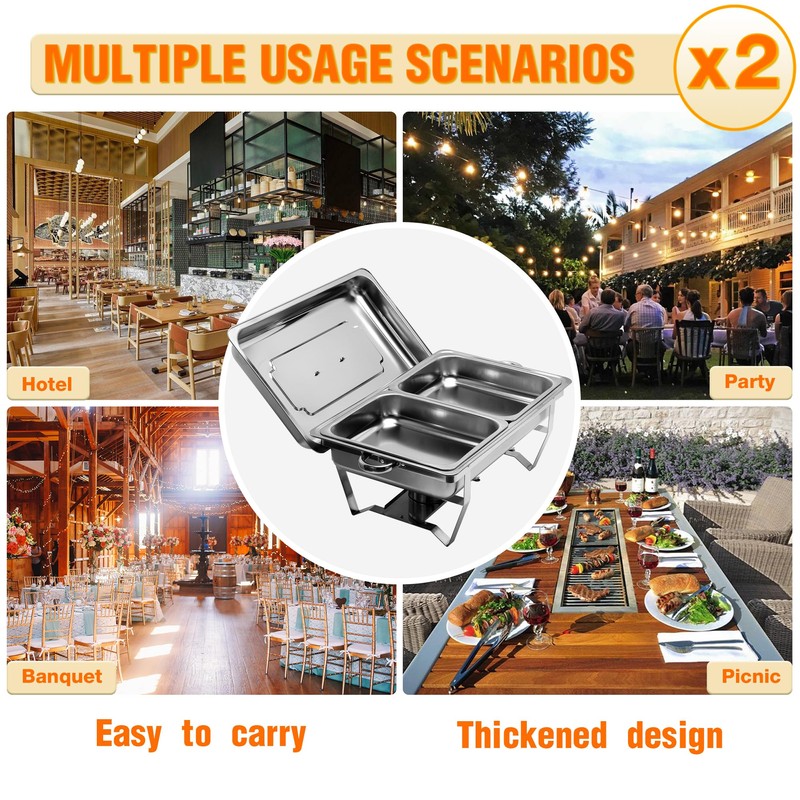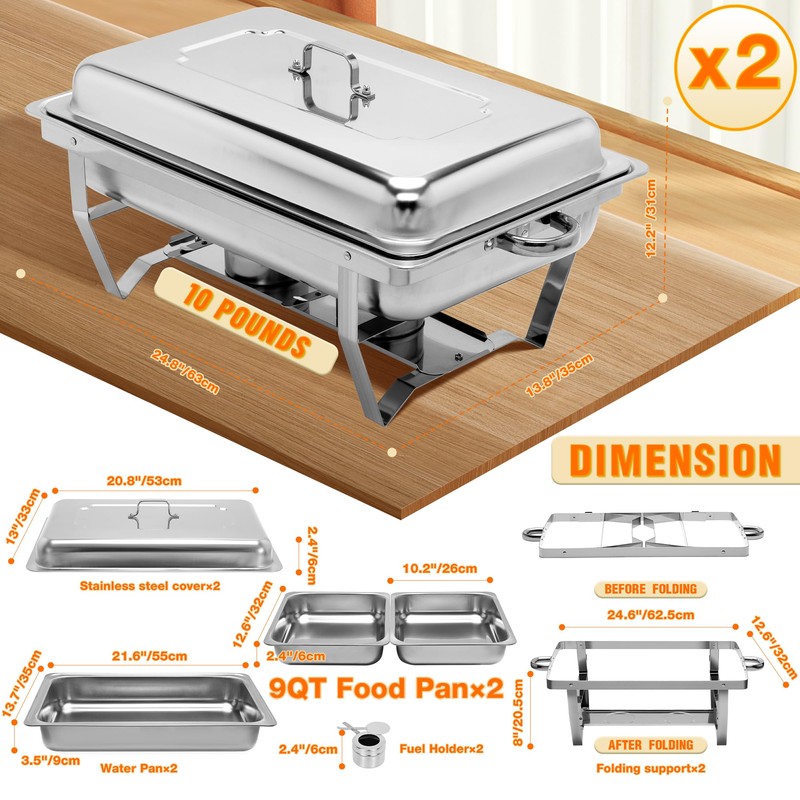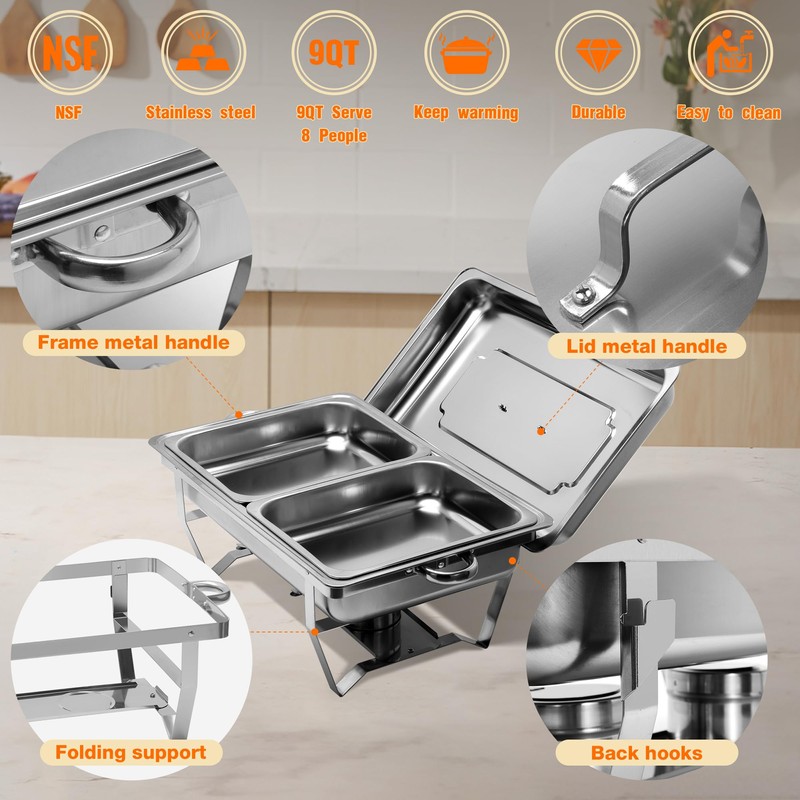 - Complete Set- 2 complete 9 quart chafer sets (each set contains 1 full-size water tray, 2 half-size food trays, 1 lid, 1 frame stand, 2 covered fuel racks) are available for you