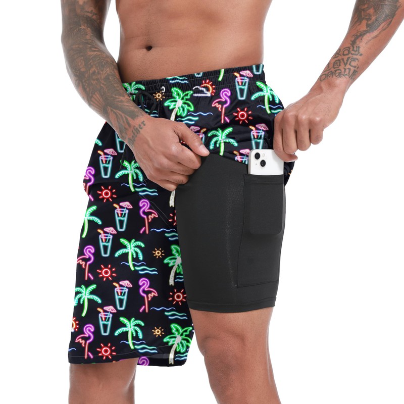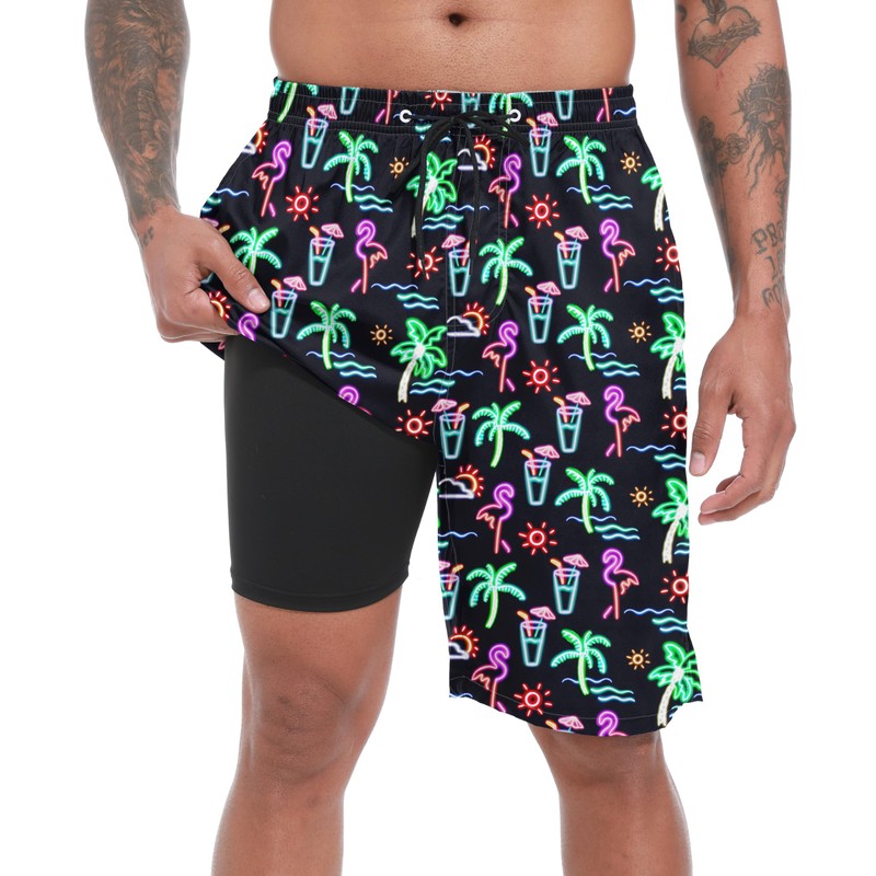 FT FENTENG Mens Swim Trunks with Compression Liner 9" Board Shorts 2 in 1 Quick Dry Beach Swimwear Bathing Suits for Men, Neon Flamingo-c, XX-Large