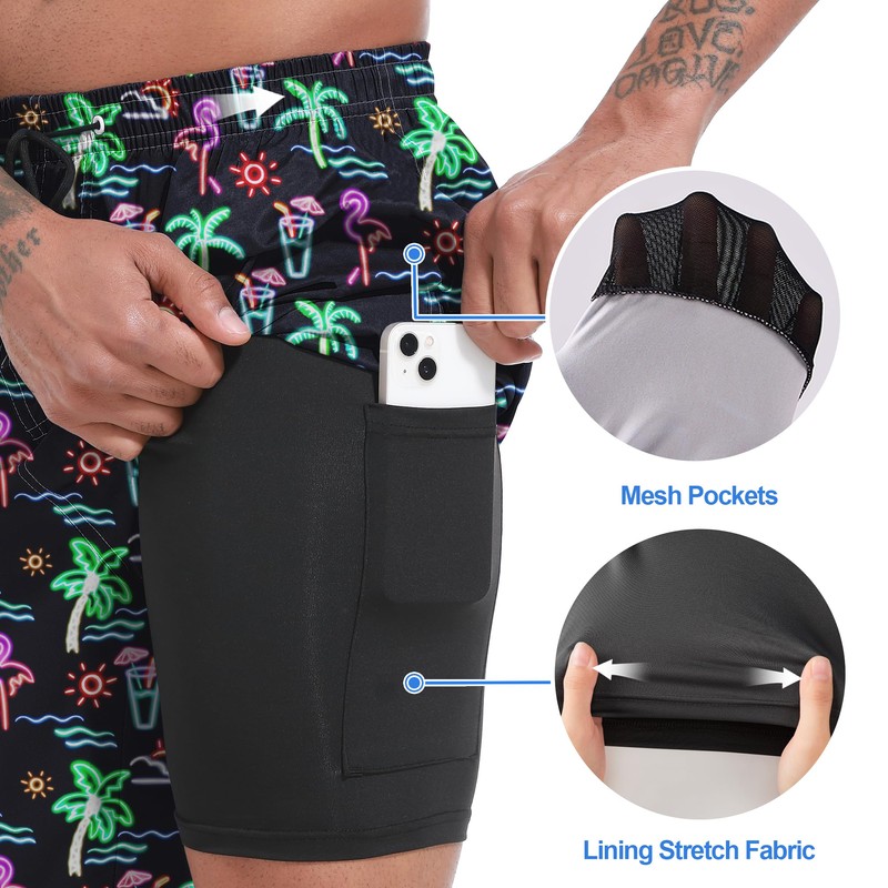 - Swim Trunks with Compression Liner: This 2 in 1 mens swimming trunks with a built-in compression boxer brief, which provides support for your thighs and helps prevent from sticking to your skin when it’s soaked. It’s stretchy, elastic, breathable and much safer than one layer shorts.