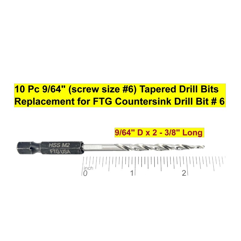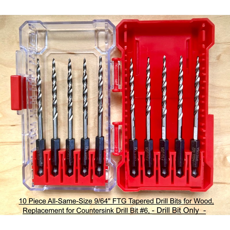 - Plastic Case Holder with 10 Pc All Same Size #6 (9/64") FTG drill bit Replacement Only, set made with tapered countersink bits for wood. Countersink replacement bits set with tapered drill bits. Top Quality 9/64 inch tapered and double flute drill bit; HSS M2 Grade 6542 the most popular High-Speed Steel, for its high toughness, and good cutting edge retention. FTG countersink replacement drill bit set for drill bits with countersink
