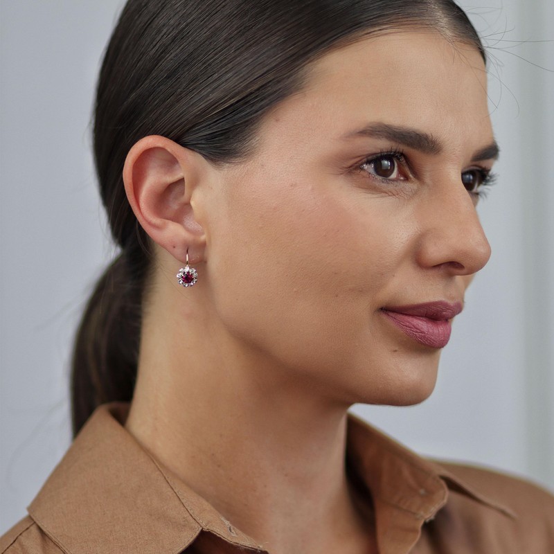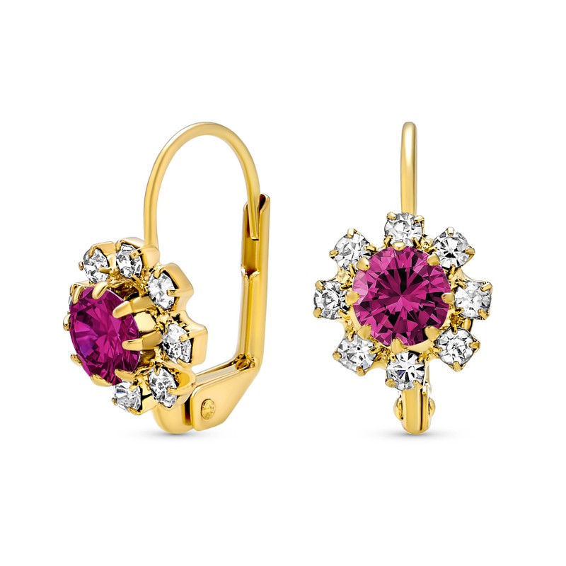 Fuchsia Pink And White Crystal Flower 18K Gold Plated Brass Lever back Drop Earrings For Women Simulated Ruby
