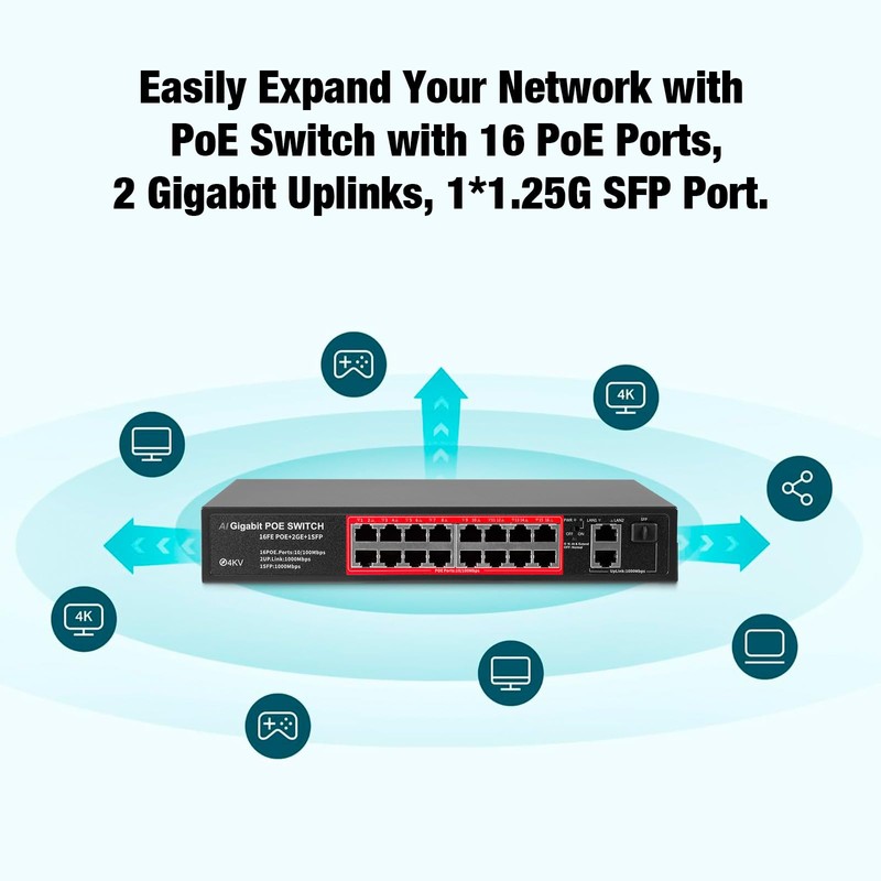 • 【16-port poe switch@240W 】PoE switch with 16*10/100Mbps ports PoE, 2 Uplink 10/100/1000Mbps self-adaptive RJ45 port and 1*1.25G SFP port, Compliant with IEEE802.3af/at standard, it can deliver up to 30W for each PoE port and has a total power budget of 120W for at most 16 PoE devices, 2 gigabit fast ethernet uplink ports for connecting NVR and Internet , high-speed connections,etc..