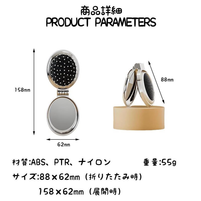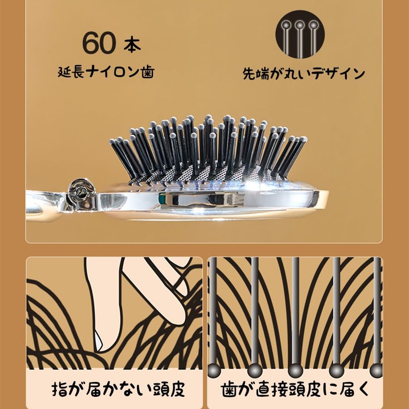 - 【2-in-1ミラー付き折りたたみコーム】:折りたたみ式で便利なトのヘアブラシ。片側は柔らかいナイロン製ブラシ、もう一方にはミラー付きで、いつでもどこでもメイクや髪型チェックが可能です。