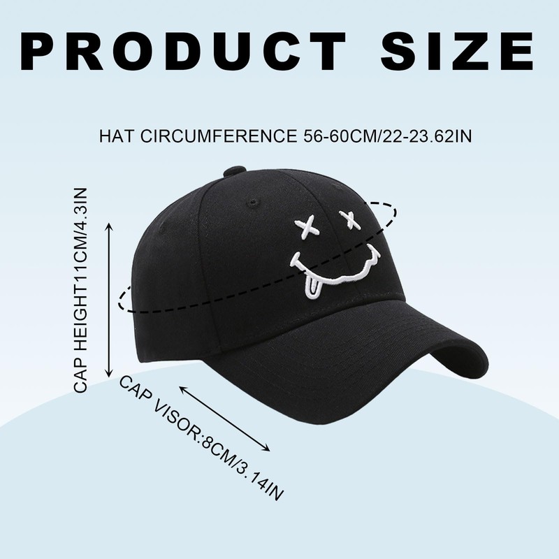 - Hochwertiges Material: Die Baseballkappe besteht aus Baumwollmaterial, das weich und atmungsaktiv ist. Die Baseballkappe mit witziger bizarrer Stickerei hat eine gute Bedeutung, jeden Tag ein Lächeln, verbreitet eine inspirierende Botschaft von Liebe und Glück, macht Sie jeden Tag voller Vitalität und bringt Ihnen ein angenehmes Sommererlebnis.