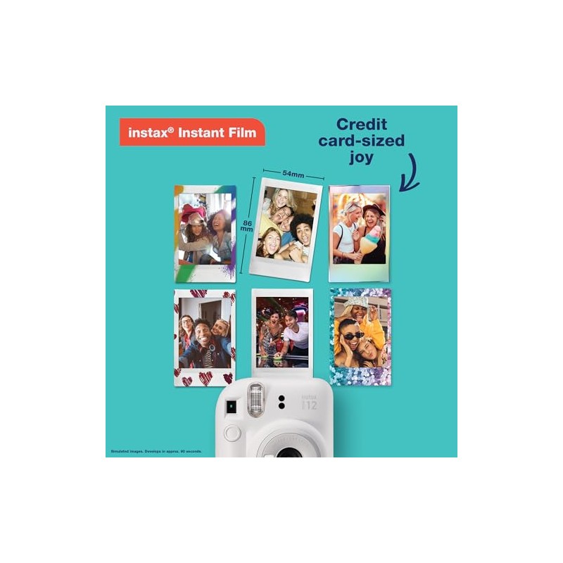 The super bubbly INSTAX MINI 12? instant camera is bursting with joy, creativity and color. Not only is this iconic instant camera available in five super cute and appealing tones C Pastel Blue, Mint Green, Blossom Pink, Lilac Purple and Clay White C it's fully loaded with easy-to-use modes and controls. Designed to keep up with life, the INSTAX MINI 12? instant camera is ready to go with a simple twist of the lens. Twist again and you're in Close-up mode, perfect for selfies. Combined with the perfectly positioned selfie mirror, automatic flash control and INSTAX MINI instant photos, the INSTAX MINI 12 instant camera is a selfie extraordinaire. But that's not all the Close-up mode can do. When activated, the viewfinder neatly pairs up with the lens, so what you see is what you get C no object shifts in your final INSTAX photo! (FYI the fancy term for this is parallax correction.) Because when you're this close, there's no room for error. Plus, with automatic exposure, you can simply aim and click. No need to adjust any settings, just simply fun photos every time. And with that in mind, once you have snapped, your INSTAX MINI instant photo will eject in approximately five seconds (development time thereafter is approximately 90 seconds). All without compromising on image quality. That deserves high fives all around. When you're finished capturing memories, twist the lens again to turn the INSTAX MINI 12 instant camera off. But the fun doesn't end there. Download the free INSTAX UP!? App to your Smartphone for a new way to keep all your INSTAX photos digitally, in one place. All you have to do is use the INSTAX UP! App and your Smartphone to scan your printed INSTAX photos and they'll be turned into sharable, digital photos that you can edit, tag and save. Ready to twist & go?