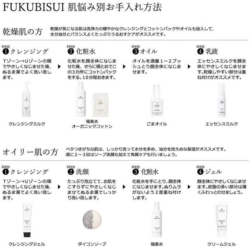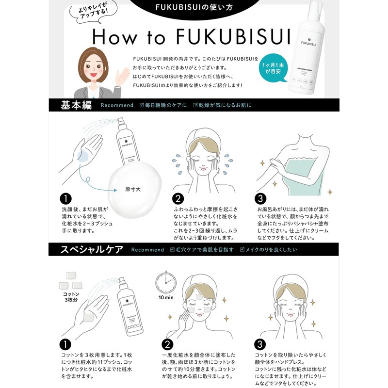 - How to Use: This "FUKUBISUI Fukumi Mizu" is the first cosmetic product you want to use after washing your face. After washing your face, take an appropriate amount on your palm and allow it to fit your entire face. Use plenty of shabby It can be used on the Use as pre-lotion in the morning and after washing your face (= apply on your skin before applying makeup) Then regular skin care (lotion, beauty solution). cream). When your skin is sensitive, apply lotion → rinse with warm water. Repeat this several times until skin roughness is relaxed. After shaving a man, men should wear it after shaving and putting it with jaba jaba. Helps condition skin after shaving. When you are concerned about the stiffness of your skin in the cotton pack. A cotton pack is recommended after taking a bath or washing your face. Once you put the fukubii on your entire face, put the cotton in the first place and pack it into your face. It is best to cover the entire face and corners of your face, but if you want to do it easily, you can use it in 3 places on your forehead and both sides. Allow for 10-15 minutes. We aim to see through your skin with a sense of transparency