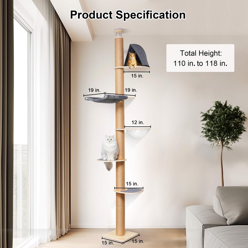 - ADJUSTABLE HEIGHT & SPACE SAVING - This modern cat tree is designed for most room, it can be adjusted from 102 to 118 inches. For low space, you can remove the middle columns to adapt the height. Besides, it only takes up 14 x 14 inches bottom space, fully utilized vertical space. Providing a relatively independent space for cats and people to live harmoniously.