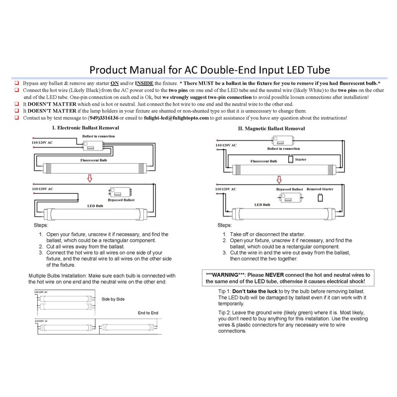 - ***Please DON'T buy if you don't expect to modify your light fixture***: MUST be directly wired to the 120V AC Power! Please disconnect Ballast (& Starter if there is any) before plugging in the bulb. Installation Manual is attached as the 2nd photo at the left upper corner of this product page!
