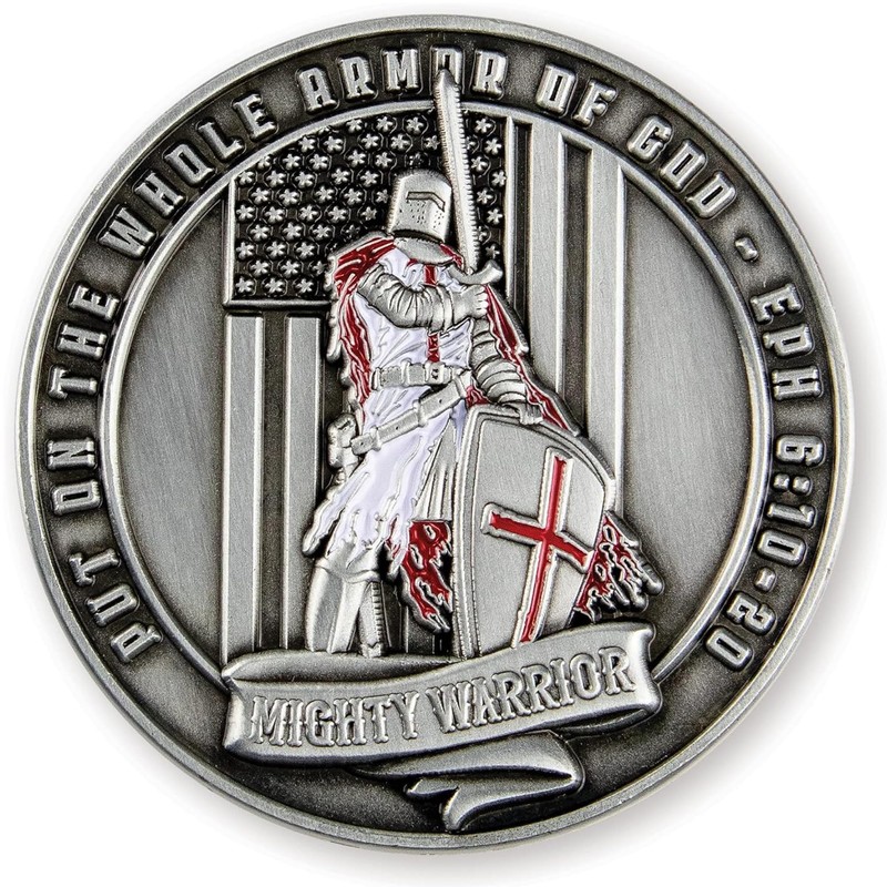- AMERIAN FLAG CHRISTIAN COIN WITH BIBLE VERSE: Front: A Templar Knight & American Flag, with text "Put on the whole armor of God - Eph 6:10-20" / "Mighty Warrior". Back: "Be strong in the Lord and in the Power of His Might" / "Stand therefore, having the belt of truth buckled around your waist, and having put on the breastplate of righteousness... And take the helmet of salvation, and the sword of the Spirit, which is the word of God.". Size: 1.75", 5mm thick