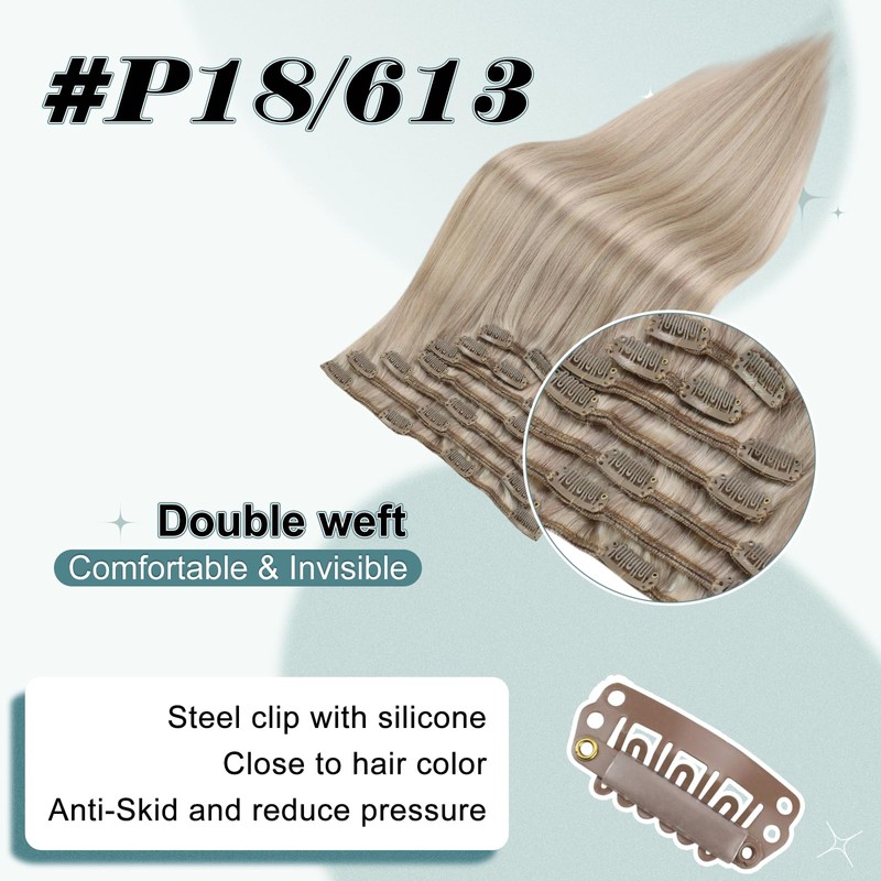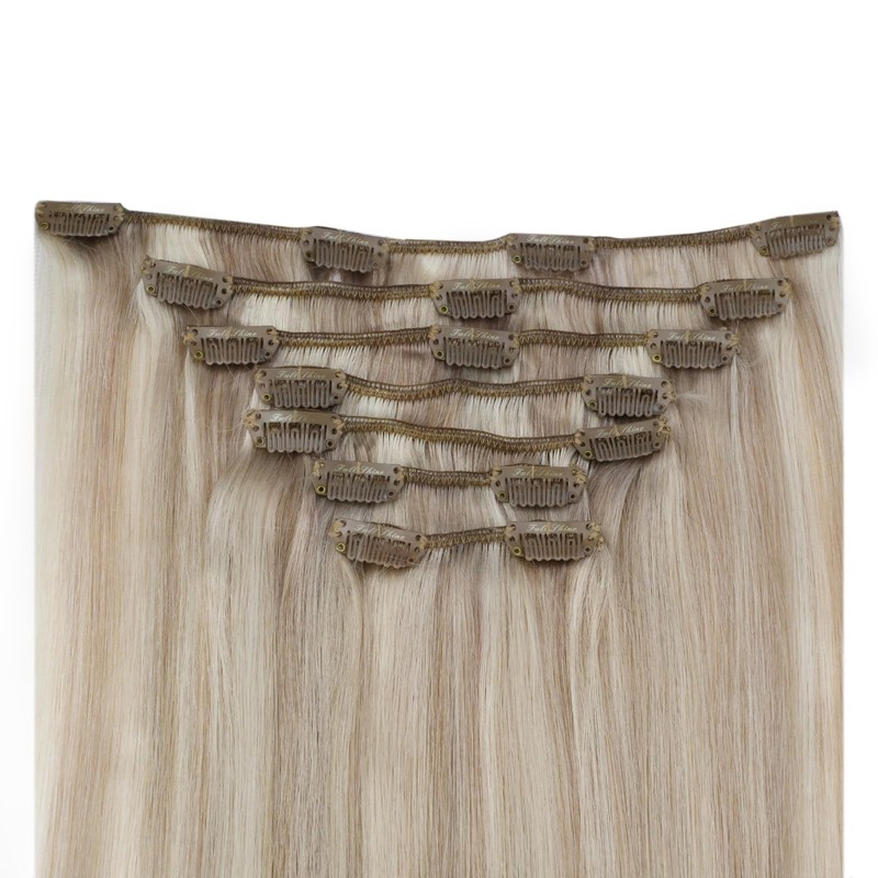Full Shine Clip in Human Hair Extensions Ash Blonde Highlighted Bleach Blonde Hair Extensions Remy Human Hair Clip ins Straight Full Head Set 20 Inch 120g 7pcs