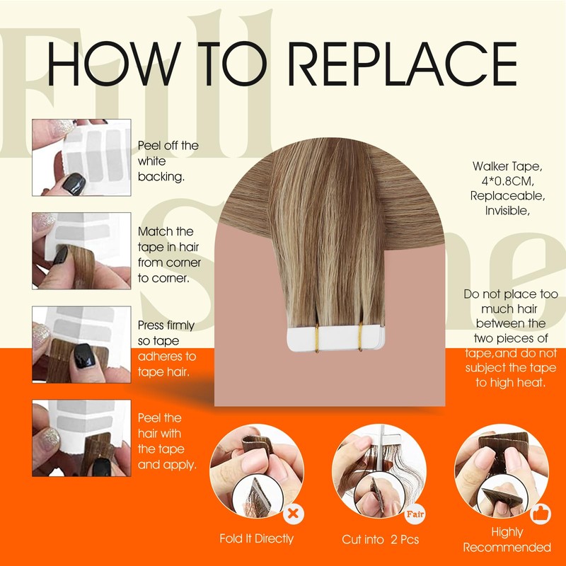 - Easy To Use: For Sandwich Method,Do Not Heat The Tape Using Excessively High Temperatures;The Two Pieces Must Be Aligned;Don't Add Too Much Hair In The Middle,These Extensions Come With A Pre-Taped Adhesive Strip,Making It Incredibly Easy To Attach Them
