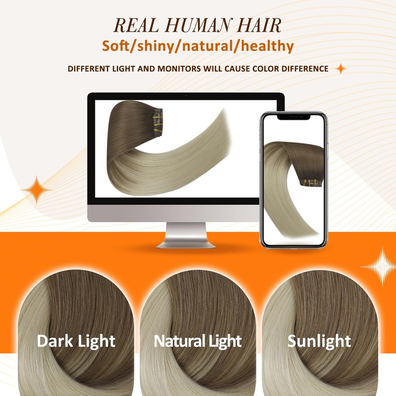 - Full Shine Seamless Clip Ins: Neat and Tight Double Weft Hair Bundles with PU Tape Sewn On, which Can Make Sure Our Product Contains More Hair, Be Thicker Than Double Weft Products but also Be More Invisible, Comfortable and Breathable than Normal Clip Hair Products