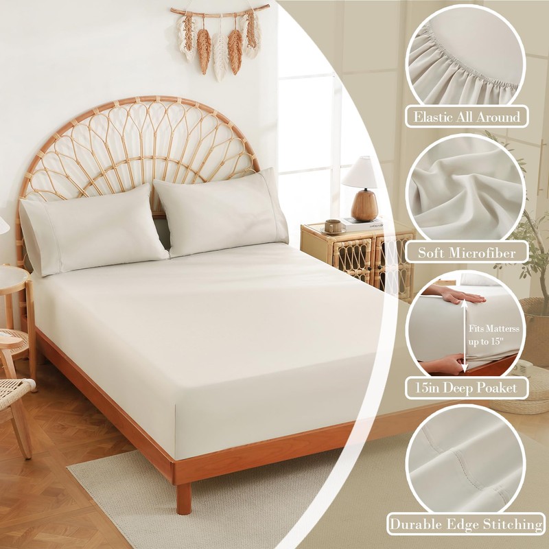 Designed for lasting comfort and effortless care, our soft microfiber sheet set fits all mattress types—from cozy Twin to spacious King (Full & Queen included). The 15-inch deep pocket sheet set securely hugs mattresses up to 5"-15" thick. With all-around elastic edges, it stays snug and slip-free, even on restless nights.