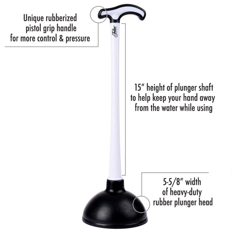 **Premium Toilet Bowl Plunger:** The Fuller Brush Toilet Bowl Plunger is designed with a unique easy-to-hold rubberized pistol grip handle to hold plunger without slipping from your hand. Pistol grip handle provides more control and added pressure without tiring of wrist. Handle from plunger to pistol grip measures nearly 15” to keep your hand away from the water. Tapered heavy duty plastic handle will not absorb water like wood handles and is easy to rinse. The plunger head is made with premium heavy duty rubber and has center circular flange for a better seal and suction against toilet trap area. **Added usage Bonus:** Plunger (with center flange pushed inside plunger) can also be used to help clear drains such as Shower, Sink and Floor Drains. **Head Size:** 5-5/8” diameter plunger head.
