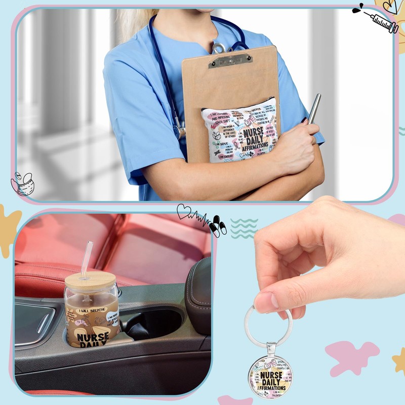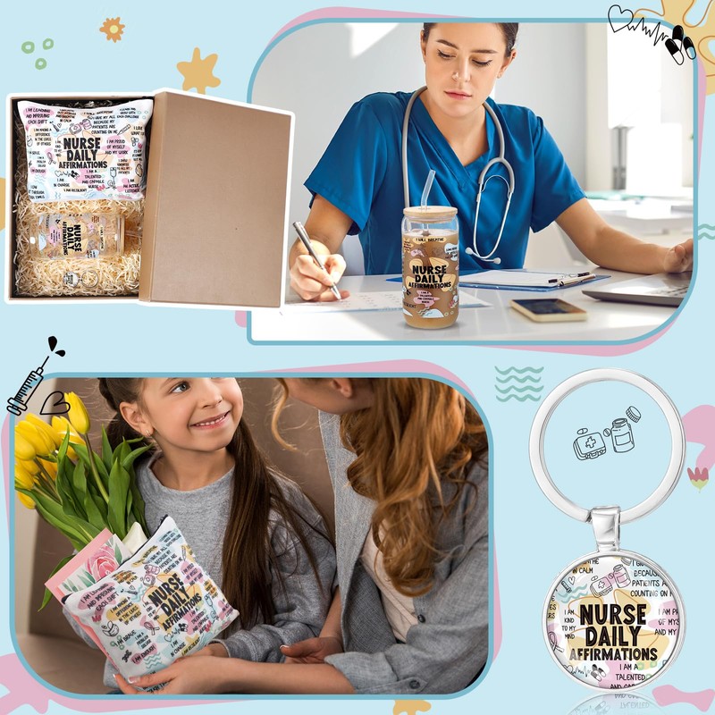 - Daily Affirmation Gift Set for Nurse: the nurse gifts for women consists of a glass cup with lid and straw, a makeup bag, and a keychain; The set features heartwarming affirmation messages paired with vibrant appealing patterns - a combination that is as meaningful as it is practical
