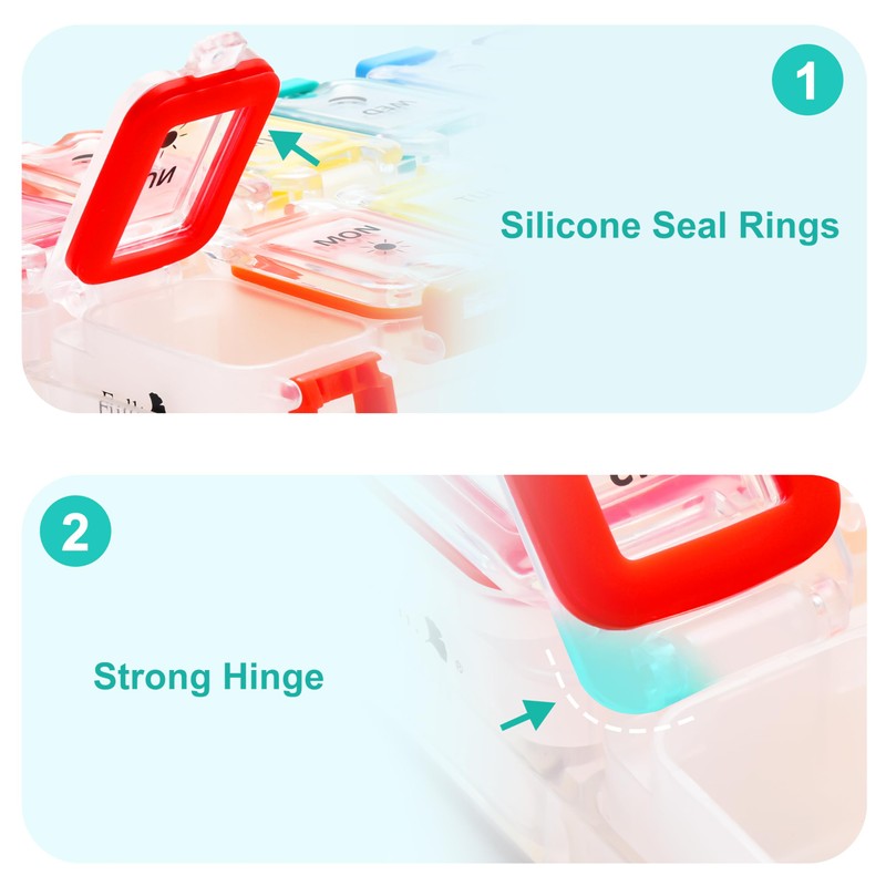 - 【Moisture Proof】Silicone seal rings on each compartment keep your pills safe from humidity & air exposure. The weekly pill organizer 2 times a day values the safety & effectiveness of your pills