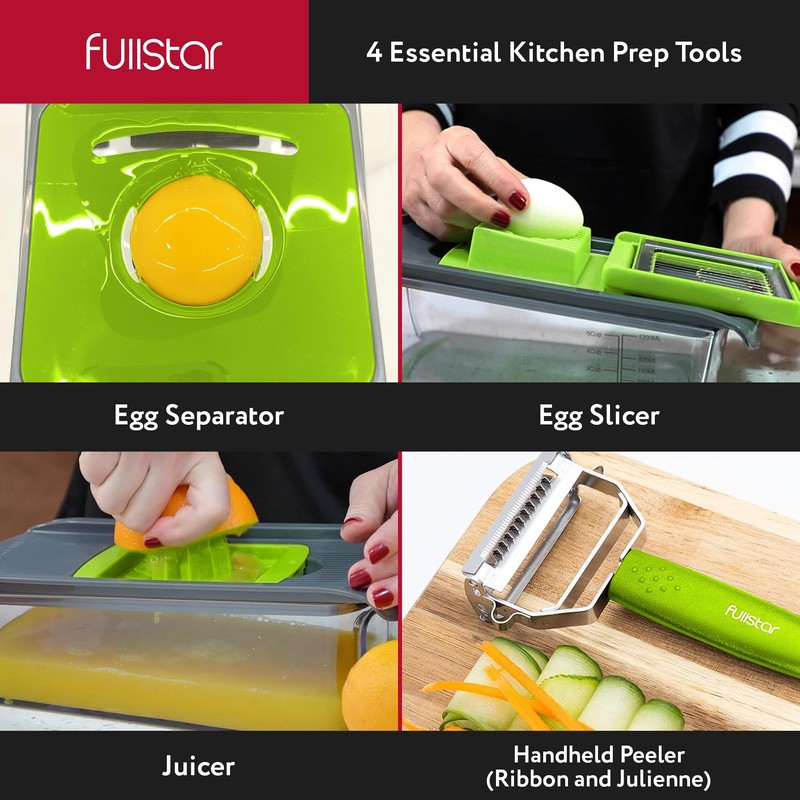 Fullstar Vegetable Chopper, Cheese Slicer, Food Chopper, Veggie Chopper, Onion Chopper, Vegetable Chopper with Container, Mandoline Slicer & Cheese Grater (11 in 1 - Gray/Green)