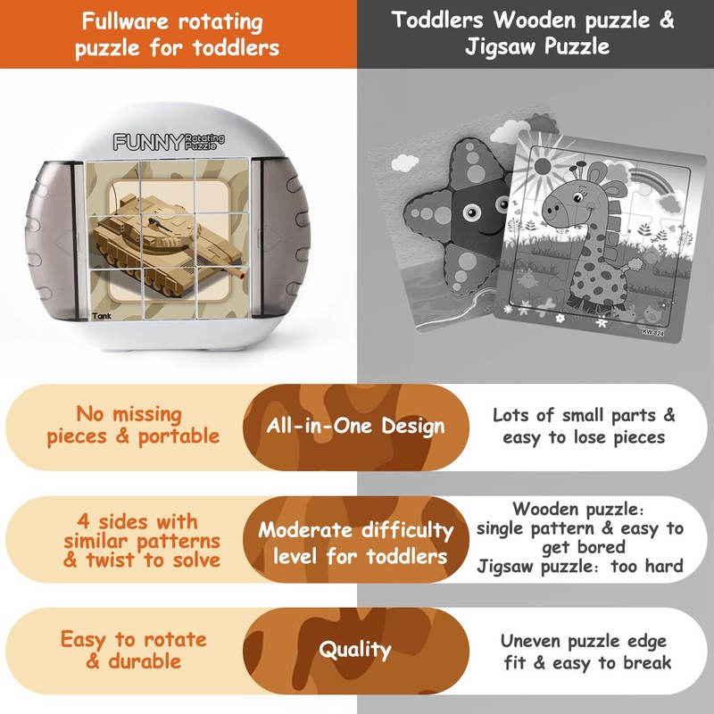 - A HANDY TOY FOR OUTINGS - Whether in the car or at a restaurant, our compact Rotating Puzzles can be carried along and it keeps children quiet and occupied. Moreover, there is no risk of missing pieces after playing with this all-in-one design puzzle!
