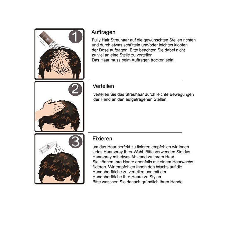 Then fix the FULLY hair fibres with standard hair spray. This ensures the optimal hold until the next hair wash.