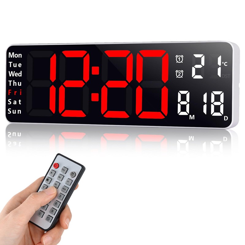 - 【13-inch LED Display】 The digital clock has a 13-inch display that shows the time, date, day of the week and temperature at the same time.