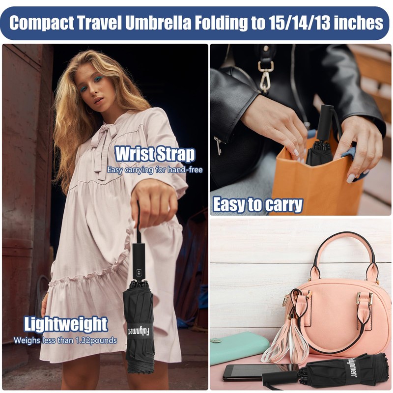 - Travel Umbrella Compact: Fulynmen large umbrella can be folded only 15 inches to pack inside the car, travel bag, or daily backpack but provides a 62 inch arc huge double canopy which is like a golf windproof large umbrellas for rain 2 people or more. No matter what Mother Nature says, the umbrella is holding up.