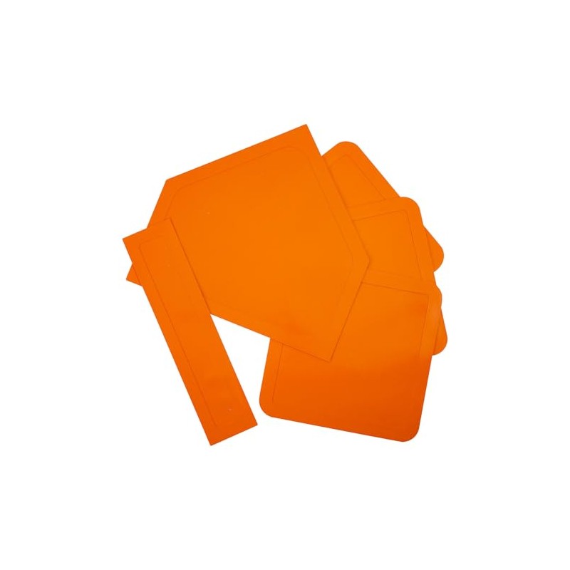 - Material: Rubber, Size: Home plate, 15 1/2" x 7 3/4" x 11 1/4"; 3 bases, 11 3/4" x 11 3/4"; pitcher’s mark, 5" x 4"