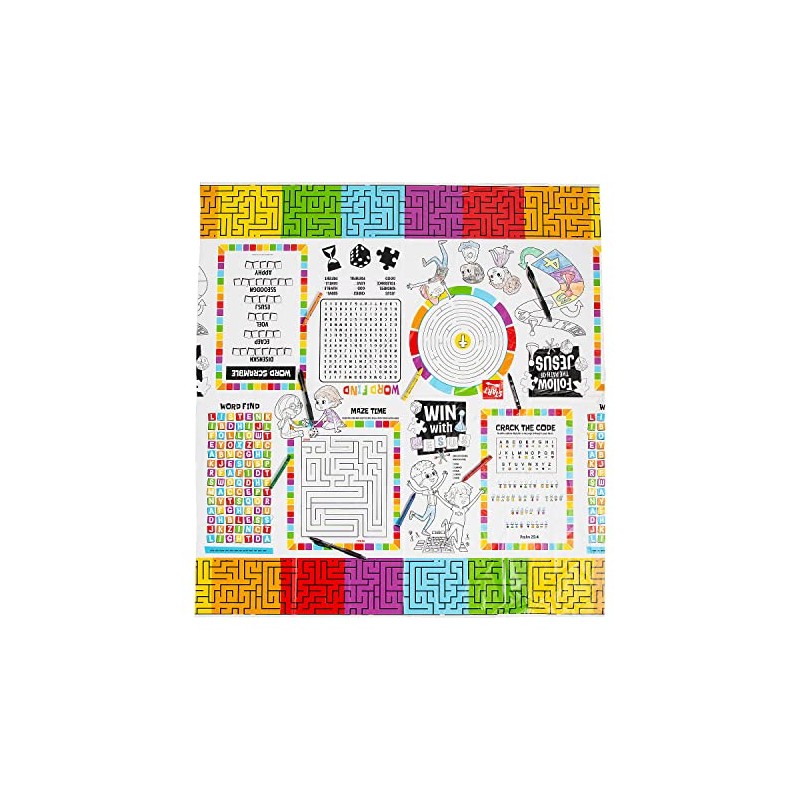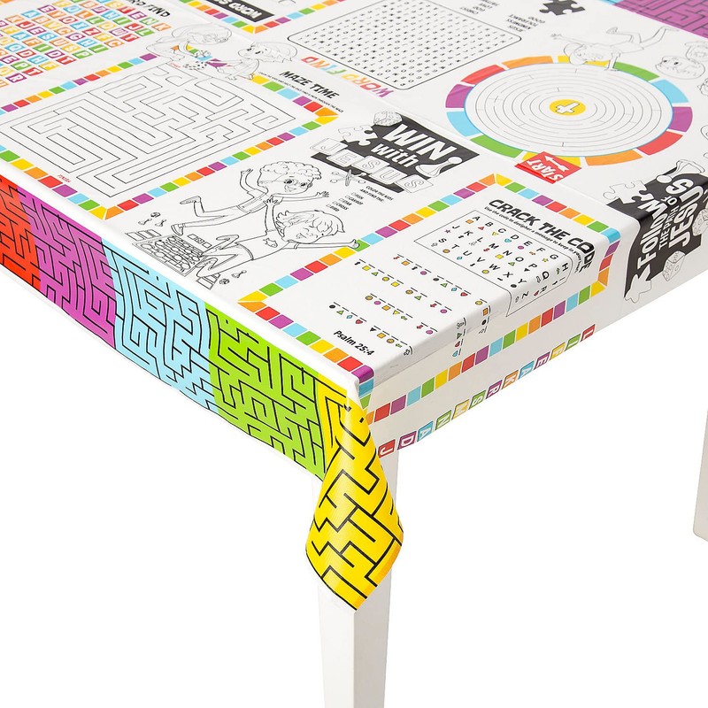 - The variety of activities on this tablecloth will keep kids occupied with faith-filled fun. Material: Plastic. Size: 36" x 40"