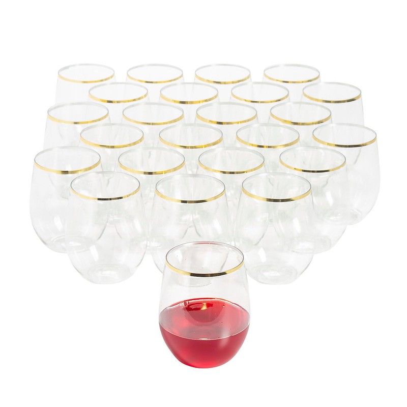- The gold trim on these glasses adds an elegance to this disposable tableware that is perfect for a wedding reception or a New Year's Eve party. Add this bulk quantity to your party supplies selection for an extra-fun event. Material: Plastic. Size: 3 3/4" 12 oz. (4 dz./unit)