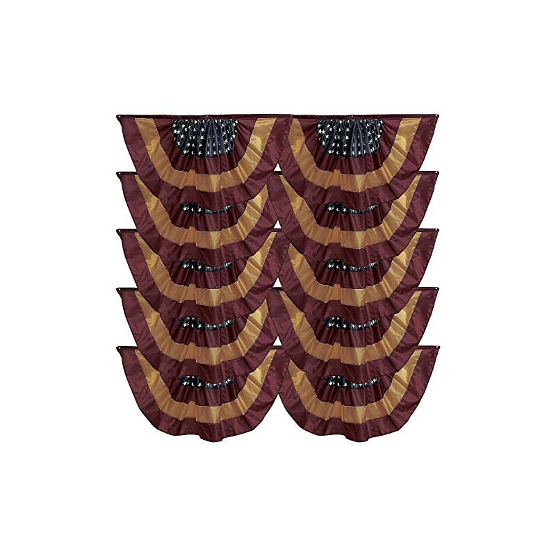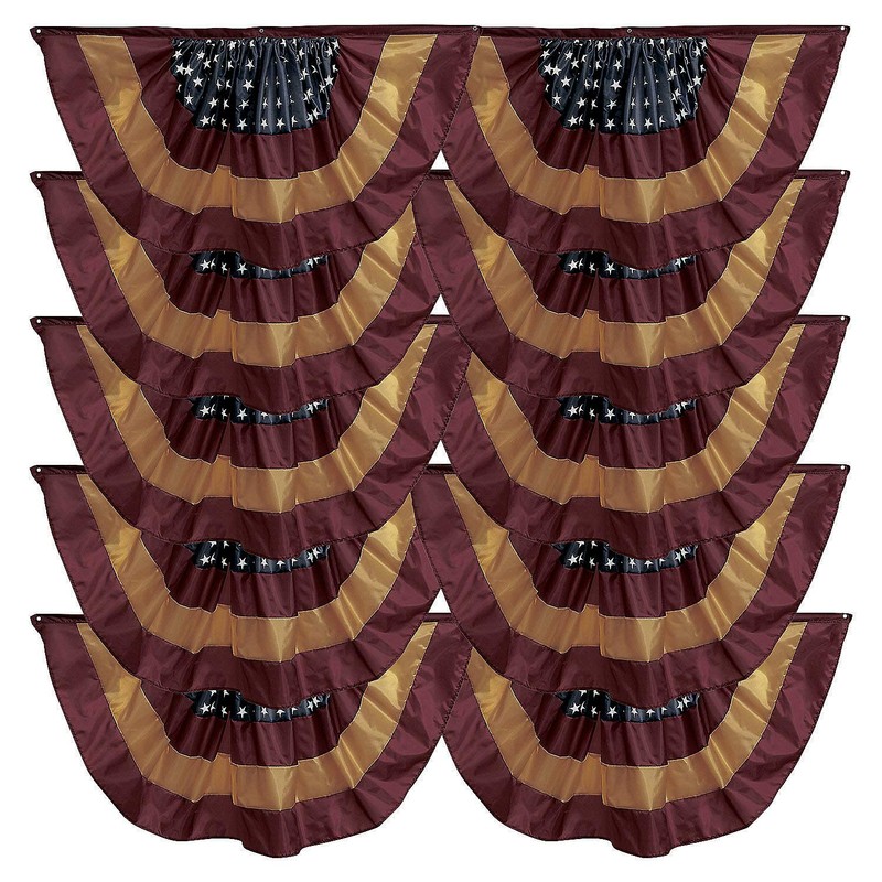 Create an impressive Americana look outdoors with these attractive buntings. Hang these along porches decks or anywhere else you’d like a patriotic Americana look. Featuring a vintage look these buntings will help harken back to simpler times when neighborhoods got together to celebrate with wholesome fun. Nylon. (10 pcs. per unit) 38 1/2"" x 21"" Includes grommets for hanging. Imported.