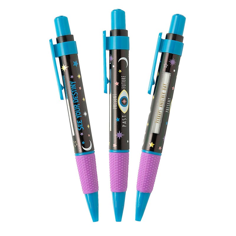 • These mystical looking pens are fun prizes to throw in gift bags or feature as giveaways at a fortune teller booth. Material: Plastic. Each pen includes 6 messages. Size: 5 1/4" Black ink.
