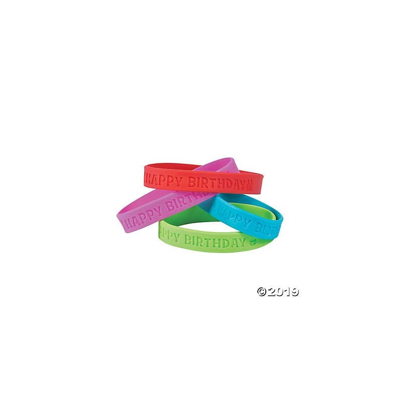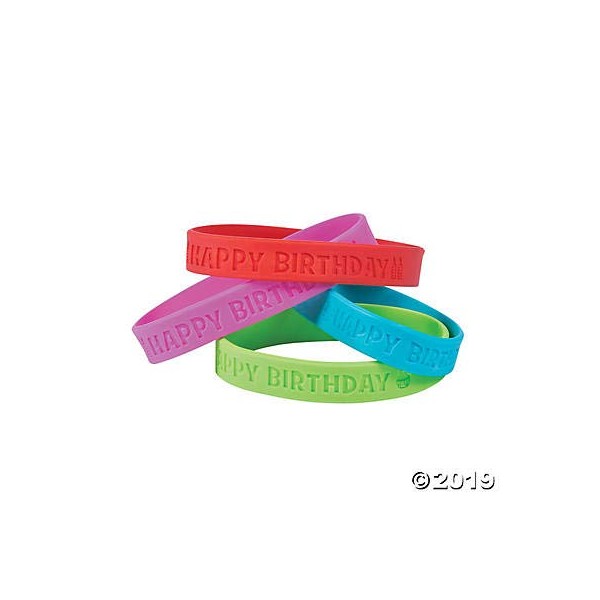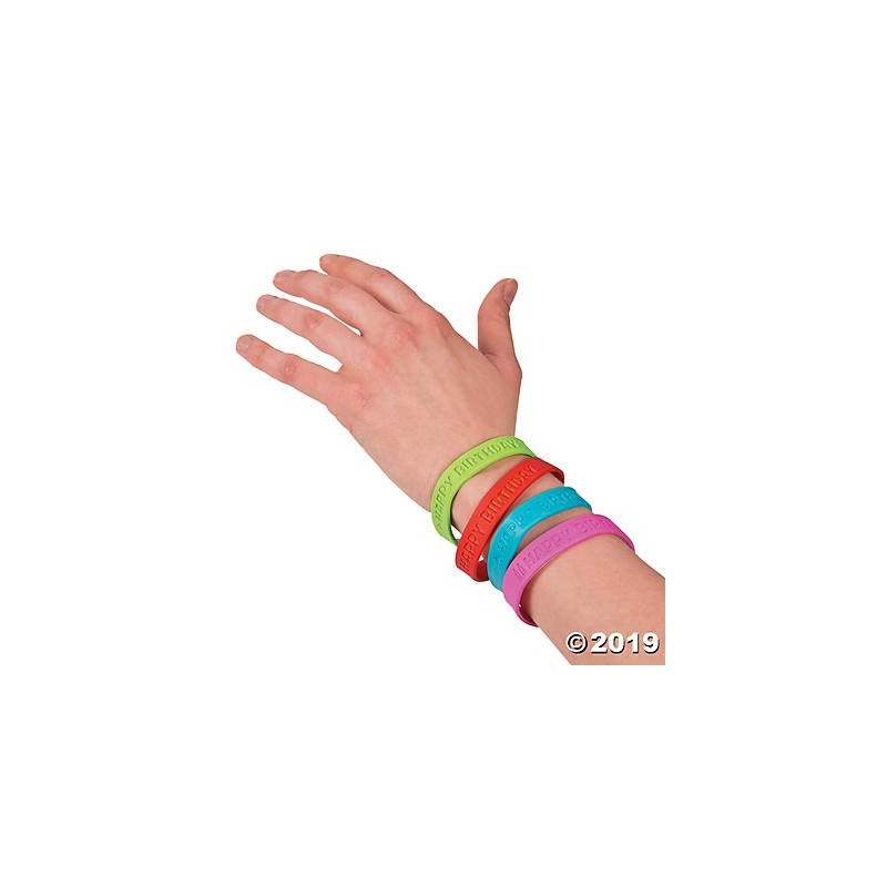 24 - happy birthday rubber bracelets - 7.5" circle - new in sealed package. Thoughtful classroom supplies that make students feel special on their big days and ideal birthday party favors.