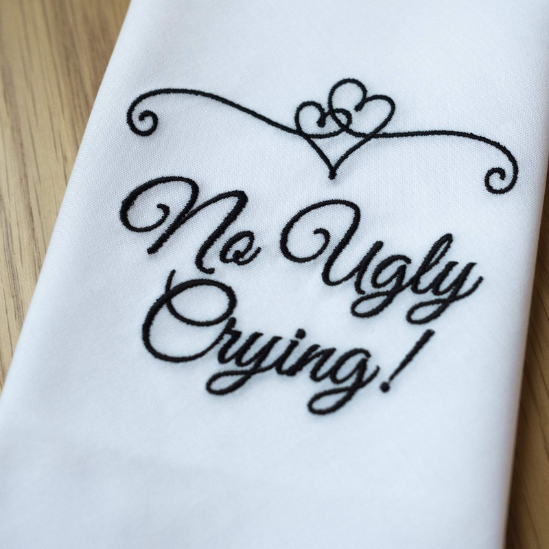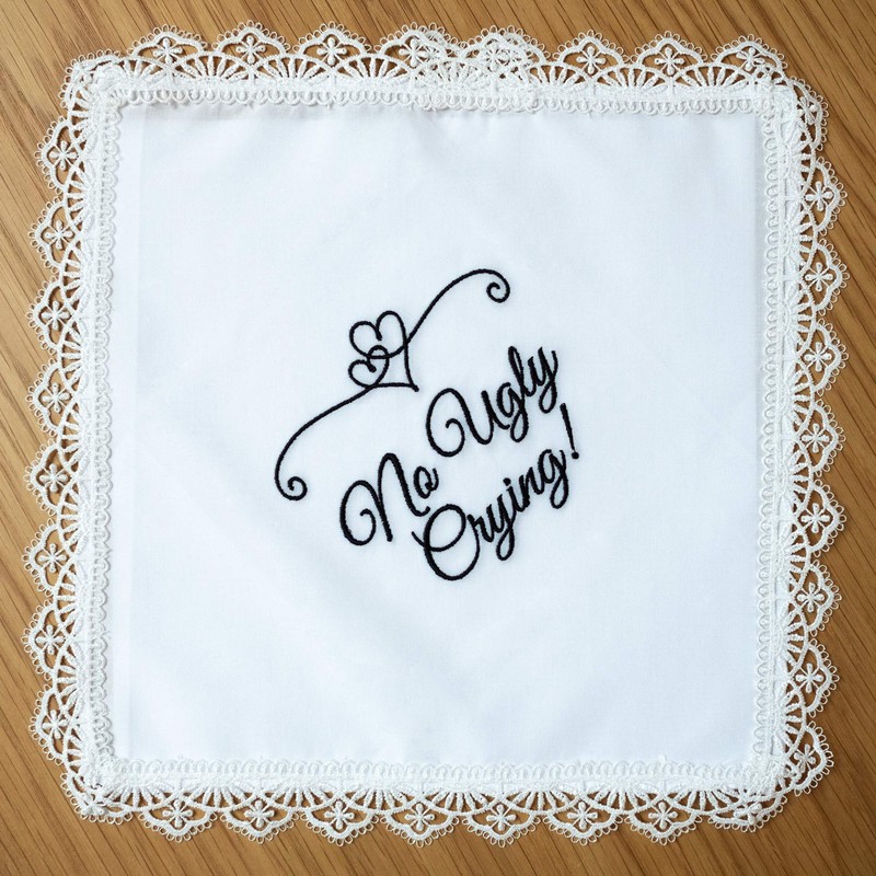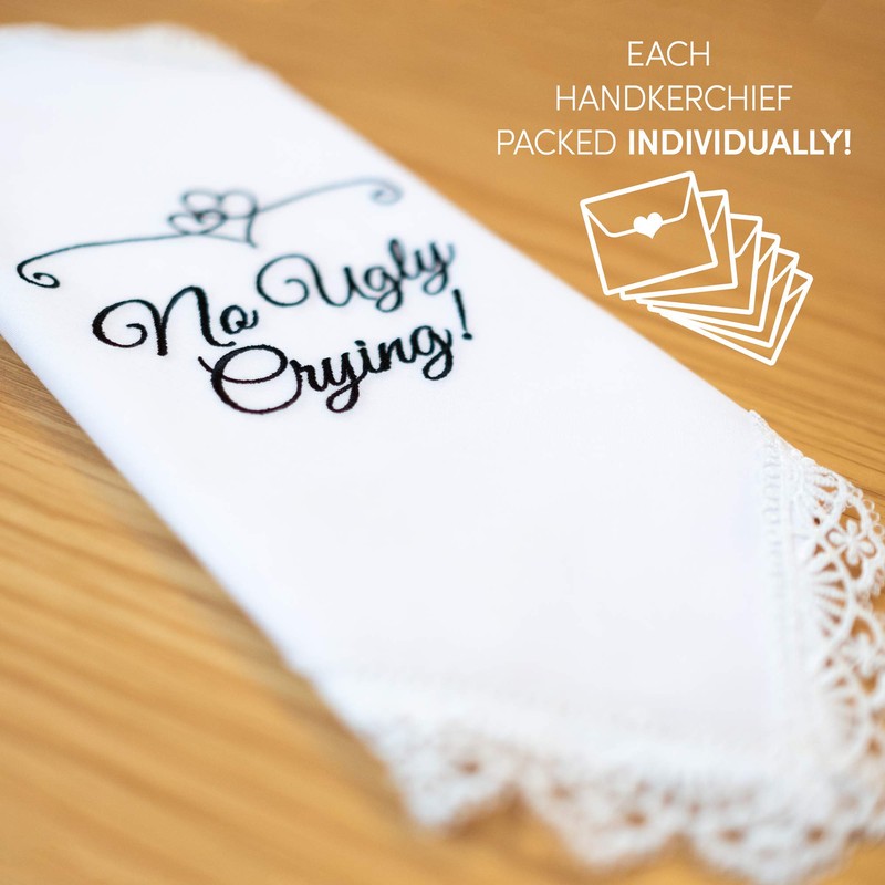 - FUN WEDDING FAVORS - keep your best friend's, bridesmaids', mom's, dad's, grandma's or any sentimental wedding guest's eyes dry. These fun gift hankies will surely make them smile! Every set includes 6 lace hankies, measuring 10" x 10" with the embroidery quote that reads: "No Ugly Crying".