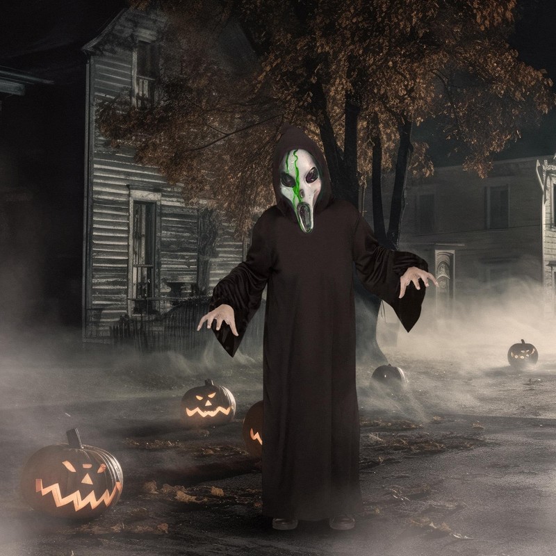 - INCLUDES: Mask, Hooded Robe, Gloves, Tubing/Hand Pump, and Theatrical ‘Alien Blood’