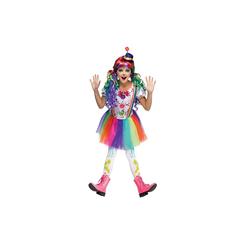 - Stand out from the crowd in this colorful crazy clown costume! This costume includes a multicolored dress, footless tights, and mini hat. Does not include wig or shoes.