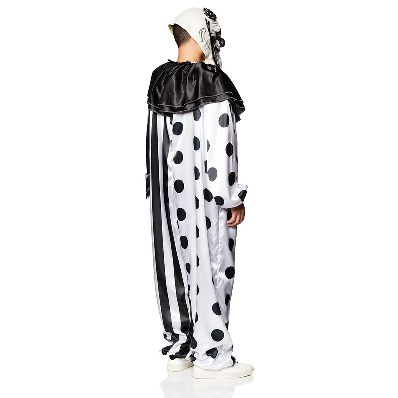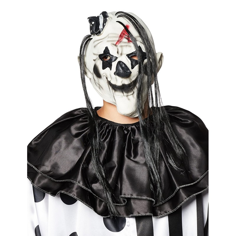 - Includes black and white jumpsuit, ruffle collar, and over the head latex mask with hair accents, mask