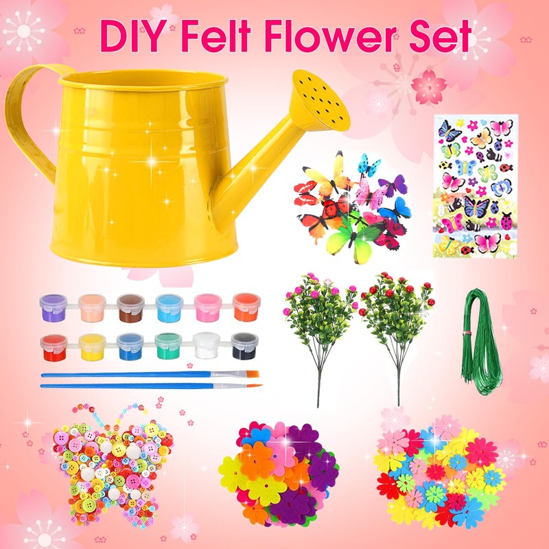 - Various materials: Our flower craft set contains different materials so that children can develop their creativity to the fullest. Buttons, felt flowers, thread, tassel, butterfly stickers and a cute yellow water bottle help young artists create unique bouquets.