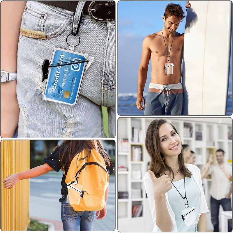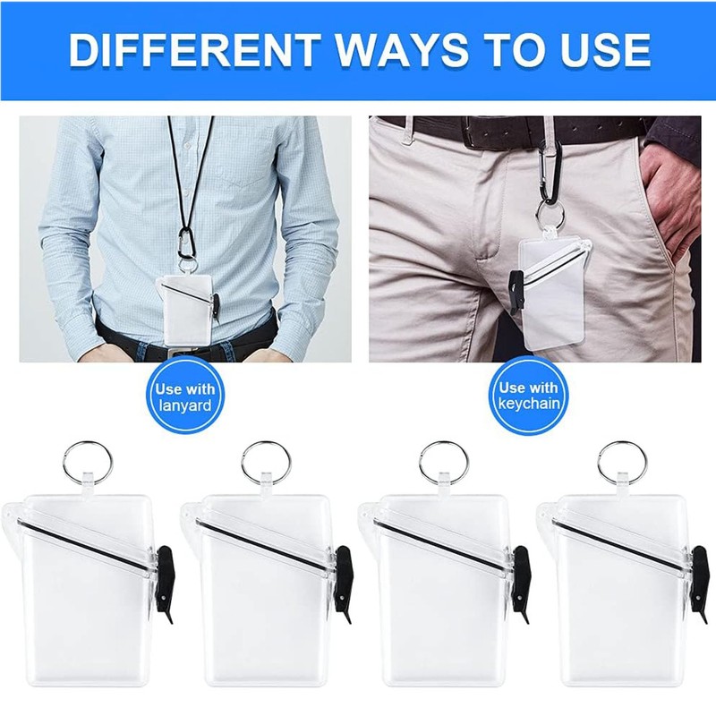 Funda Impermeable para identificación/Insignia, Funda impermeable para tarjetas de identificación, funda deportiva impermeable, soporte vertical para insignias con cordón y llavero (paquete de 4)