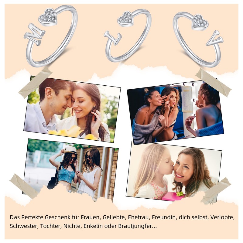 - Adjustable rings for women: the size of the heart initial rings is adjustable and fits easily and comfortably on all finger sizes. The heart ring has an opening diameter of 18 mm and a width of 1-2 mm. The initial letter ring uses an open stackable design that is suitable for women, teen girls, girls and women. You don't have to worry about the letter ring won't fit your fingers.