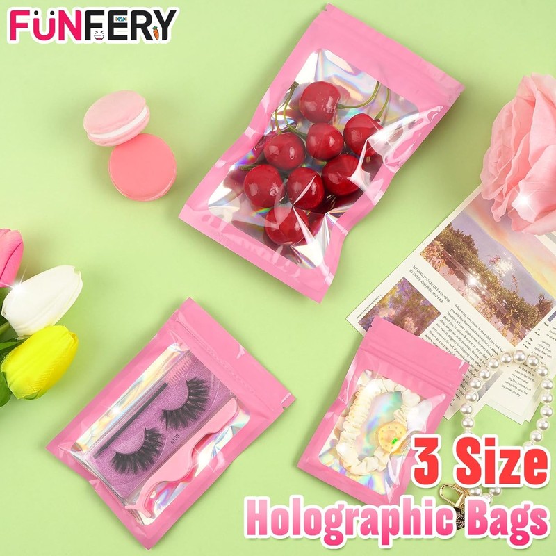 Funfery 300 Pack 3 Size Mylar Holographic Bags with Clear Window, Resealable, Smell Proof, Zipper Foil Bags for Food Storage, Sample, Small Business (Pink, 3x4.7, 4x6, 4.7x7.9in)